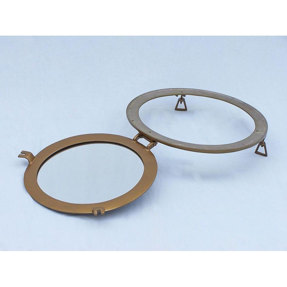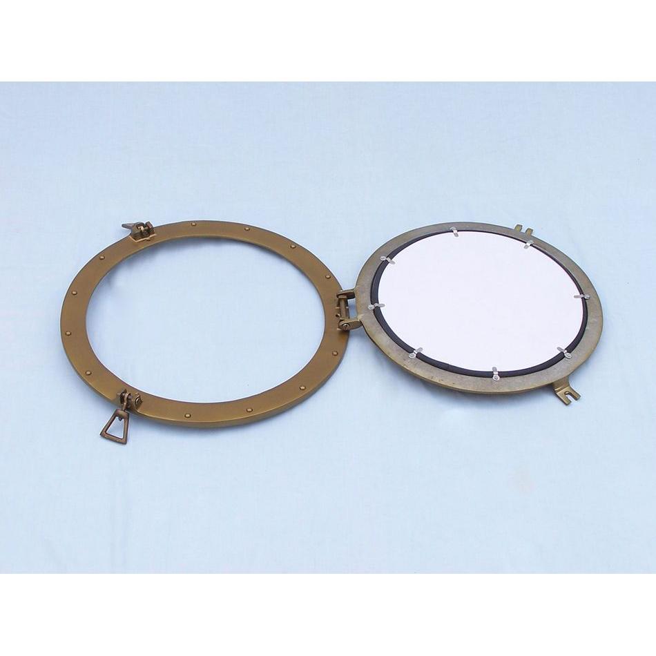 This Antique Brass Deluxe Class Porthole Mirror 20" adds sophistication, style, and charm for those looking to enhance rooms with a nautical theme. This porthole mirror has a sturdy, heavy and authentic appearance, and is made of brass and glass which can easily be hung to grace any nautical theme wall. This all antique brass porthole mirror makes a fabulous style statement in any room with its classic round frame, metal-like rivets and two dog ears.
