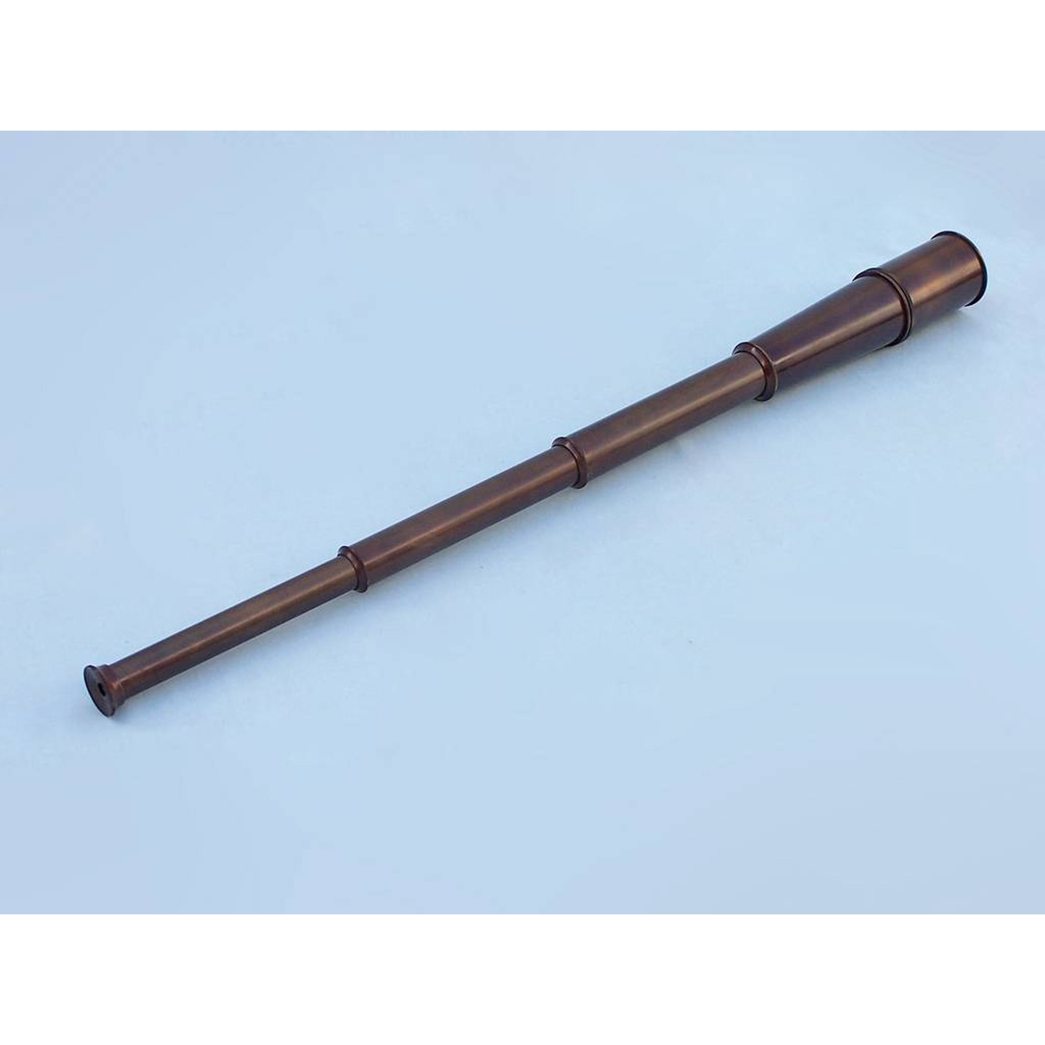 The Hampton Collection Bronze Spyglass with Rosewood Box 36" is the top of the line hand held telescope and will fit splendidly into your nautical home. The spy glass measures 36" when its five bronze tubes are fully extended. The spy glass is 9" when collapsed and is hand-painted a vintage antique finish. Simply adjust the telescope tube length to bring image into clear focus.