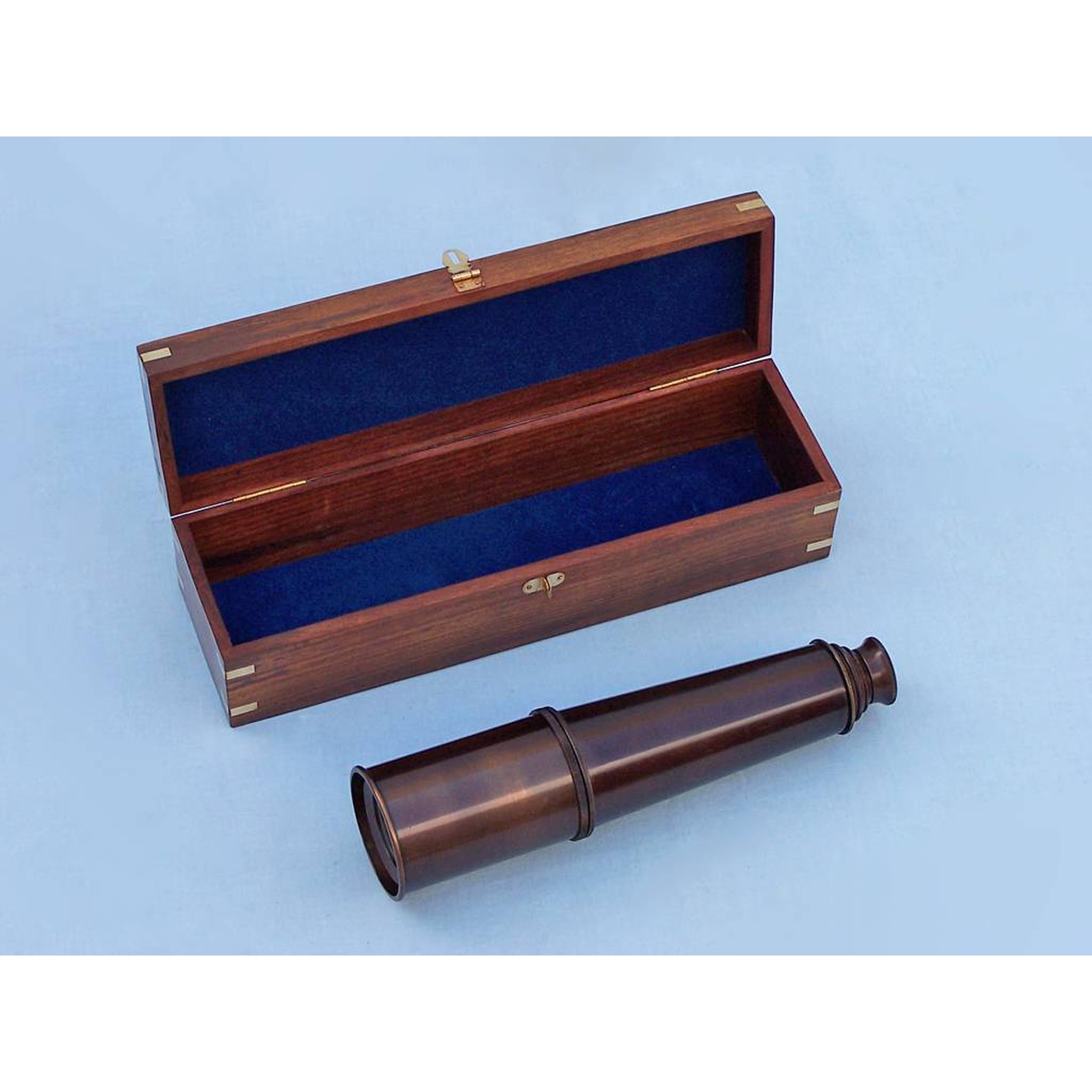 The 36" spy glass is shipped in a beautiful felt-lined brass-inlaid hardwood case. The box features brass side inlets on all sides and the Hampton Nautical solid brass anchor-with-rope logo on the top of the box. The box is smooth finished hardwood, gloss finished, measuring 9.5" wide with a solid brass clasp in front.