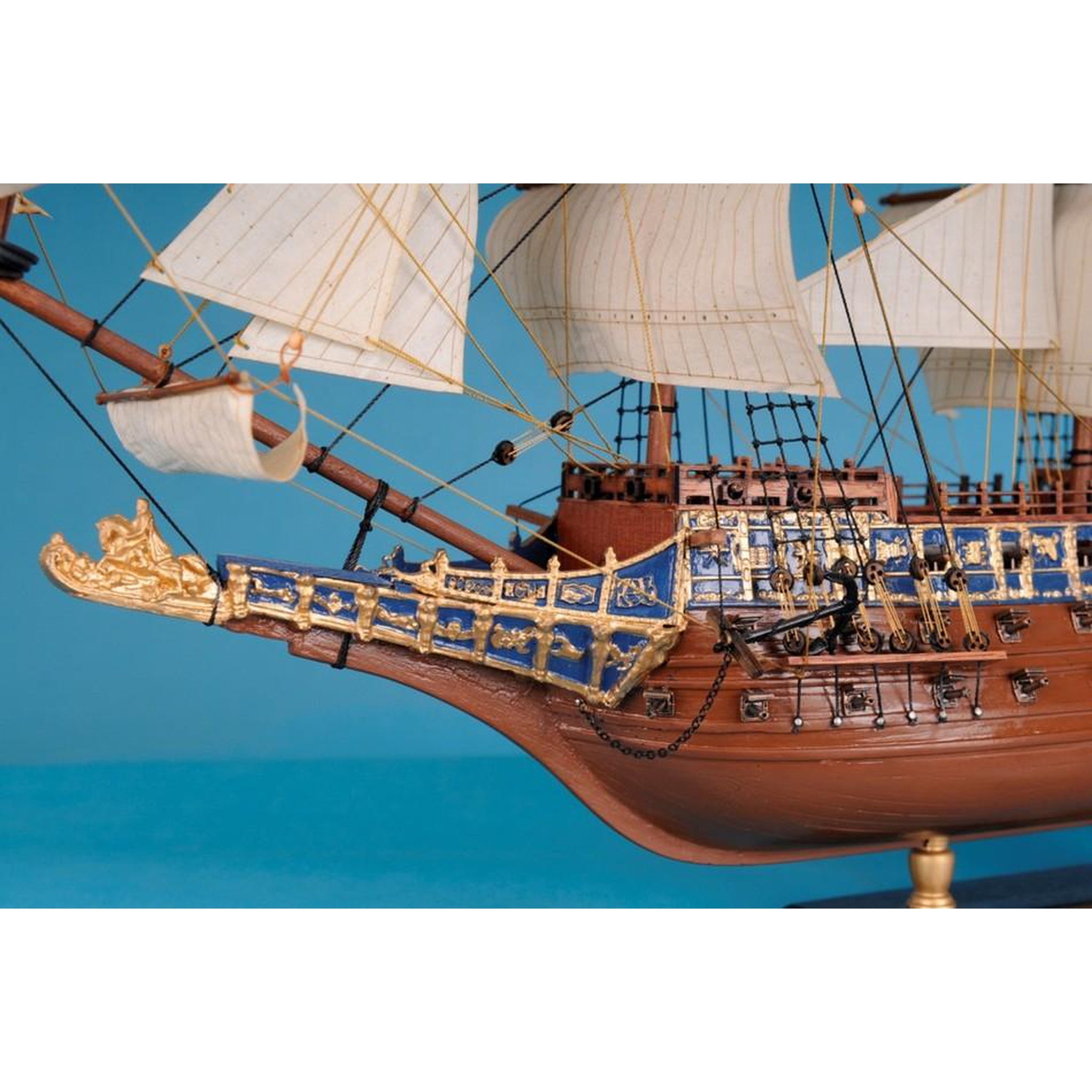 The Sovereign of The Seas Limited 21" was the most extravagantly decorated tall ship built for the English Royal Navy. Initiated by Charles I in 1634, this lavish ship carried 102 bronze cannons, and gilded carvings from stern to bow. In creating a model ship to match the extravagence of the Sovereign of the Seas, our builders have spent numerous hours matching the precision and detail originally ordered by English Royalty some 4 centuries ago.