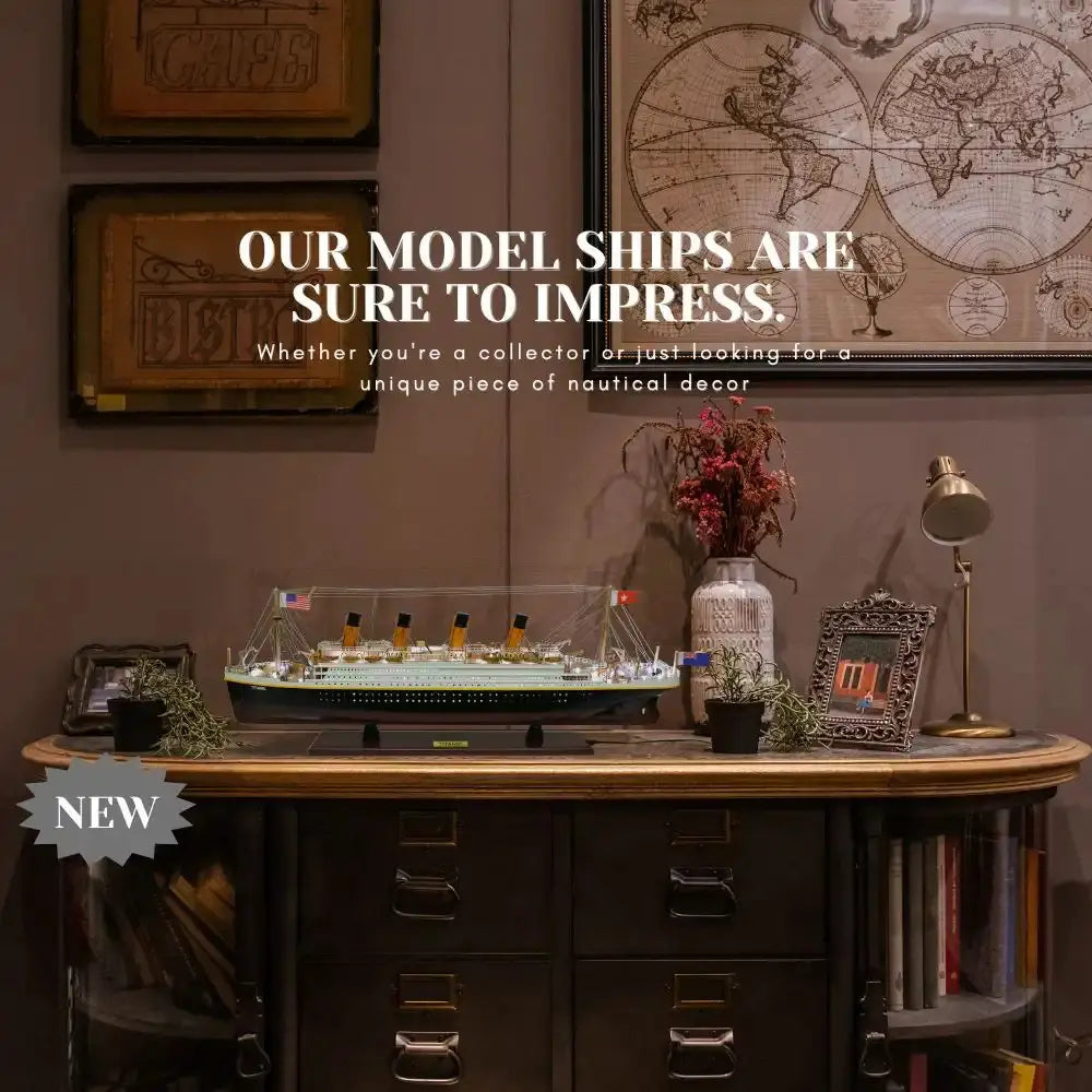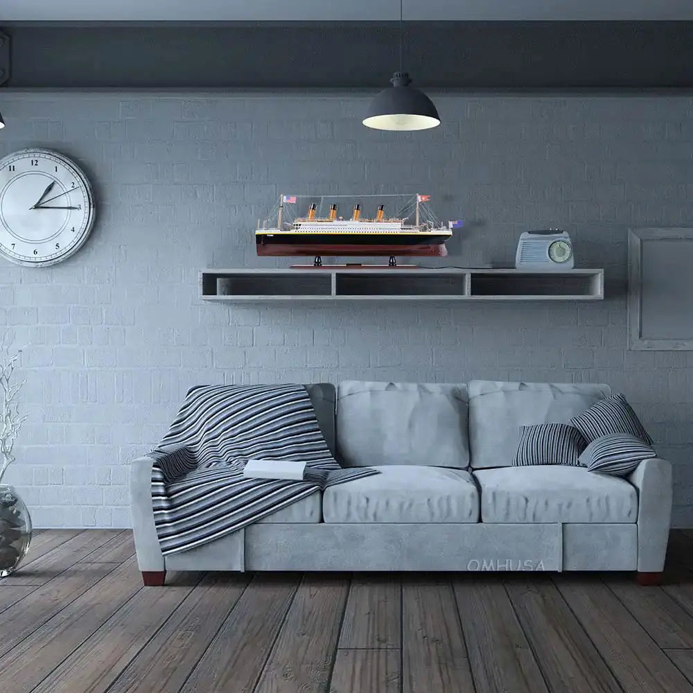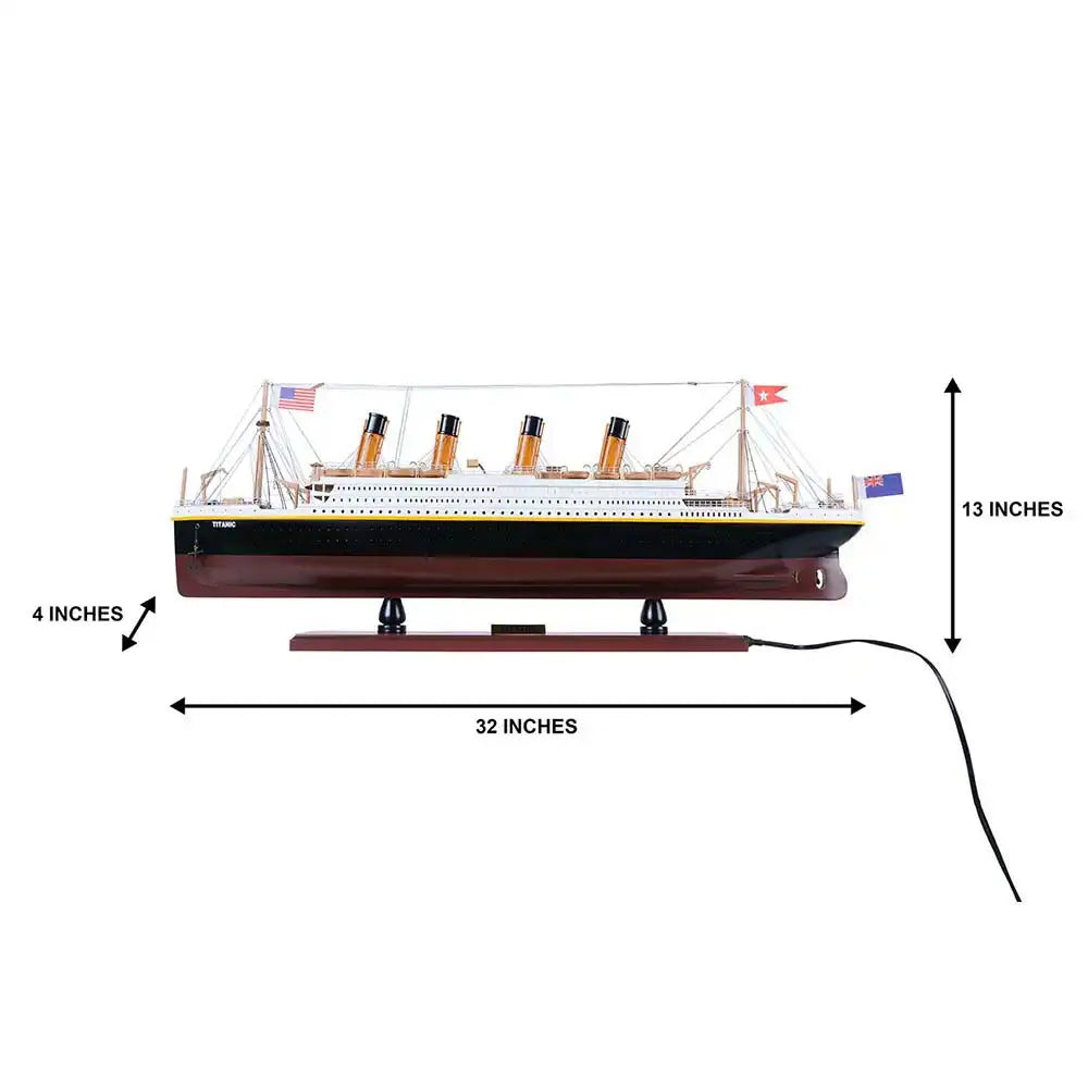 The model comes with beautiful LED lights both from inside and on top of the deck. It is painted in red, black, and white to represent the original colors of Titanic. You can find hundreds of intricate details on this model. All lifeboats are meticulously handcrafted from wood. All rigging are accurately built according to scale. The intricate pieces such as: the crane, anchors, stanchions, windows, ladders, steam pipes, and skylight really make this model a master piece.